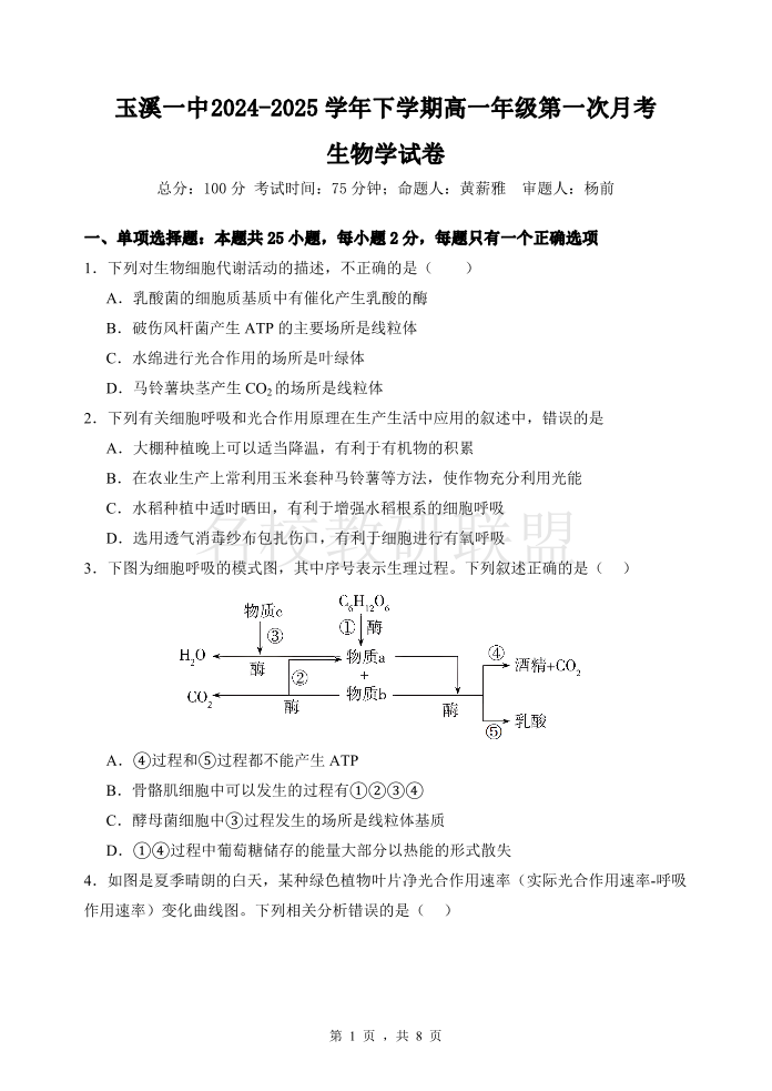 云南省玉溪市一中2024-2025学年高一下学期3月月考 生物.pdf