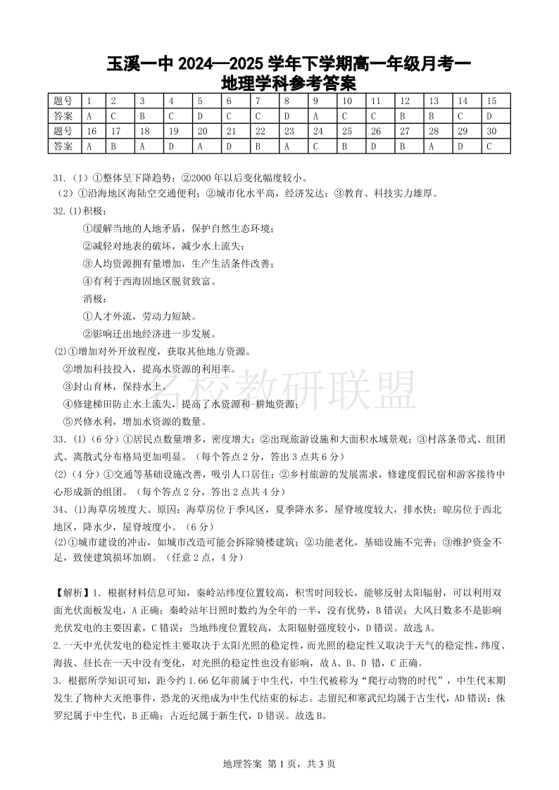 云南省玉溪市一中2024-2025学年高一下学期3月月考 地理答案.pdf