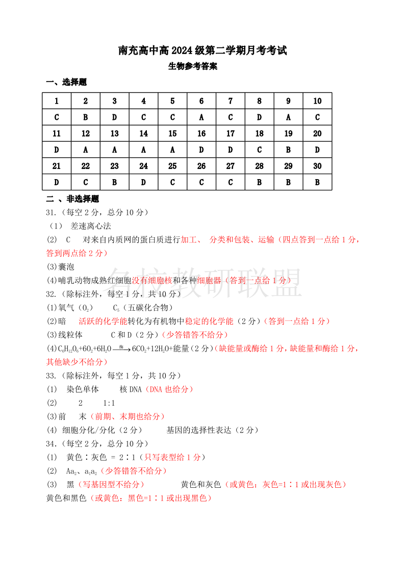 四川省南充市高级中学2024-2025学年高一3月月考 生物答案.pdf