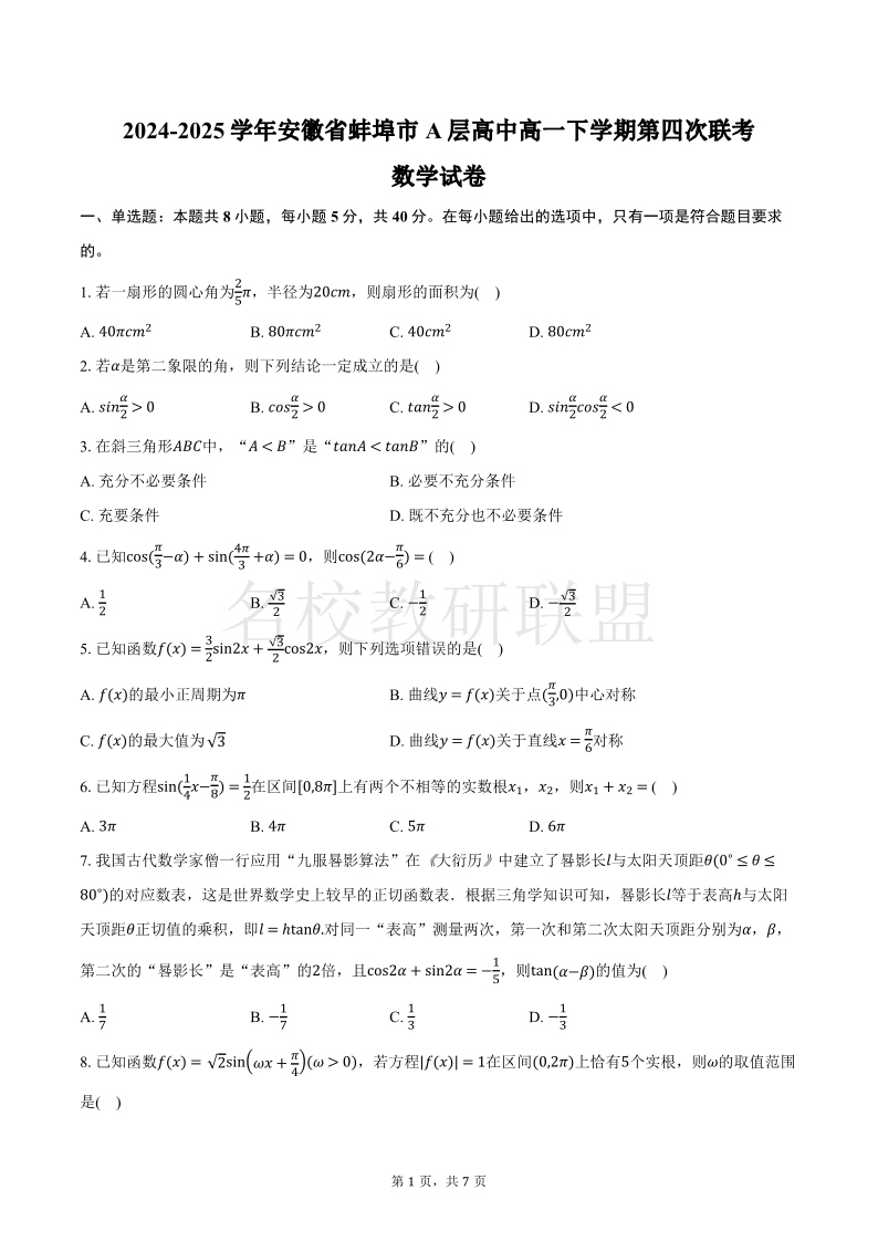安徽省蚌埠市A层高中2024-2025学年高一下学期第四次联考 数学(含答案).pdf