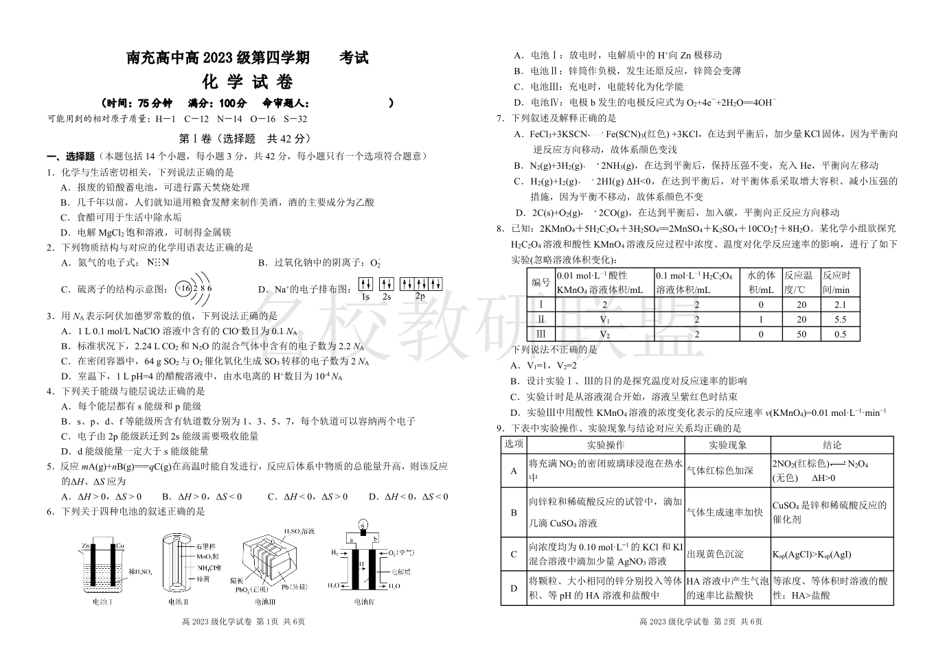 四川省南充市高级中学2024-2025学年高二3月月考 化学.pdf