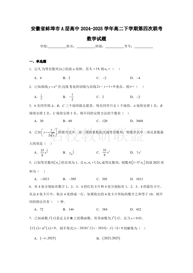 安徽省蚌埠市A层高中2024-2025学年高二下学期第四次联考 数学(含答案).pdf