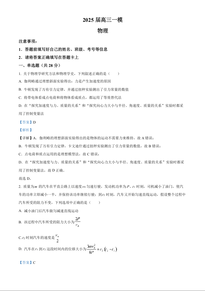 湖南省长沙市地质中学2025届高三下学期一模 物理答案.docx