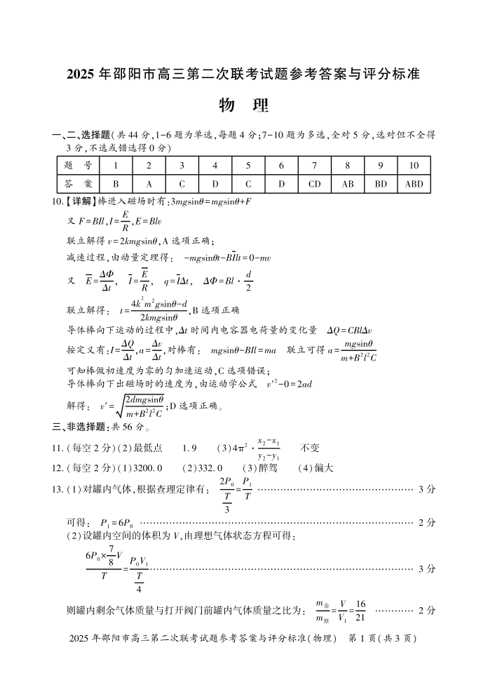 2025年邵阳市高三第二次联考 物理答案.pdf