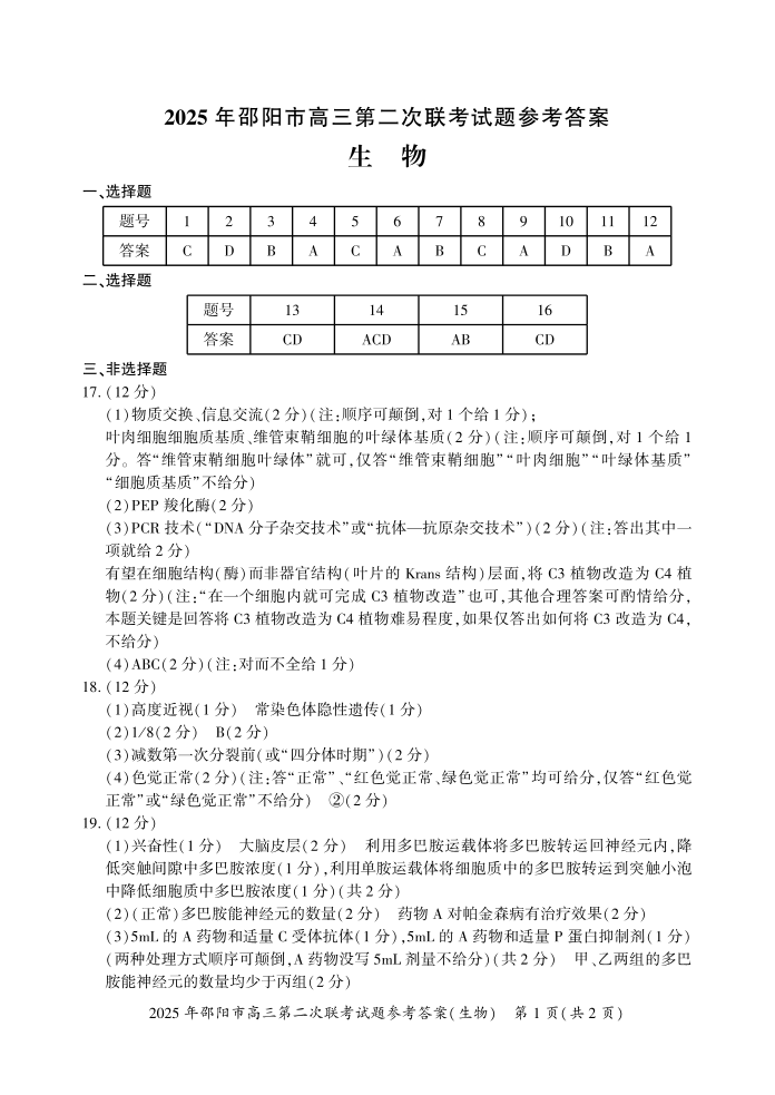 2025年邵阳市高三第二次联考 生物答案.pdf