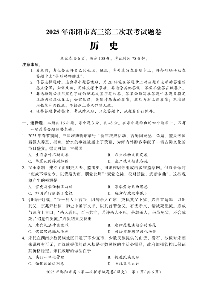 2025年邵阳市高三第二次联考 历史.pdf