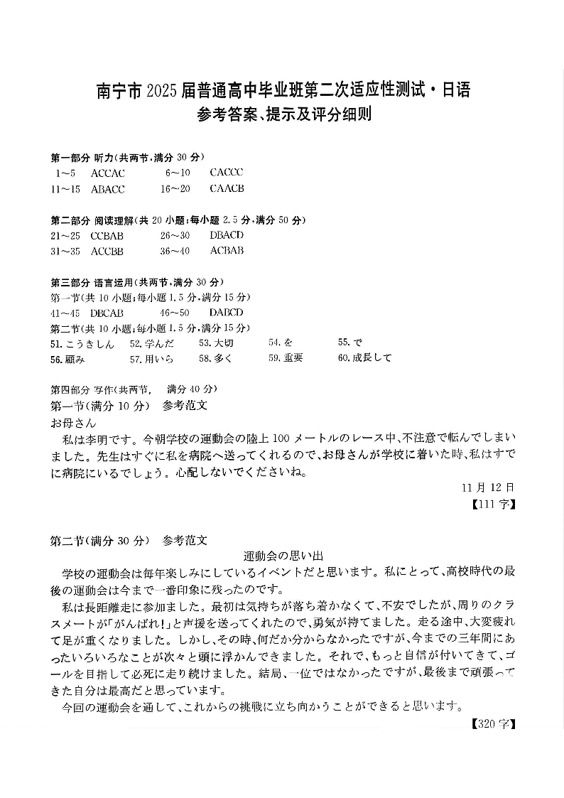 南宁市2025届普通高中毕业班第二次适应性测试 日语答案.pdf