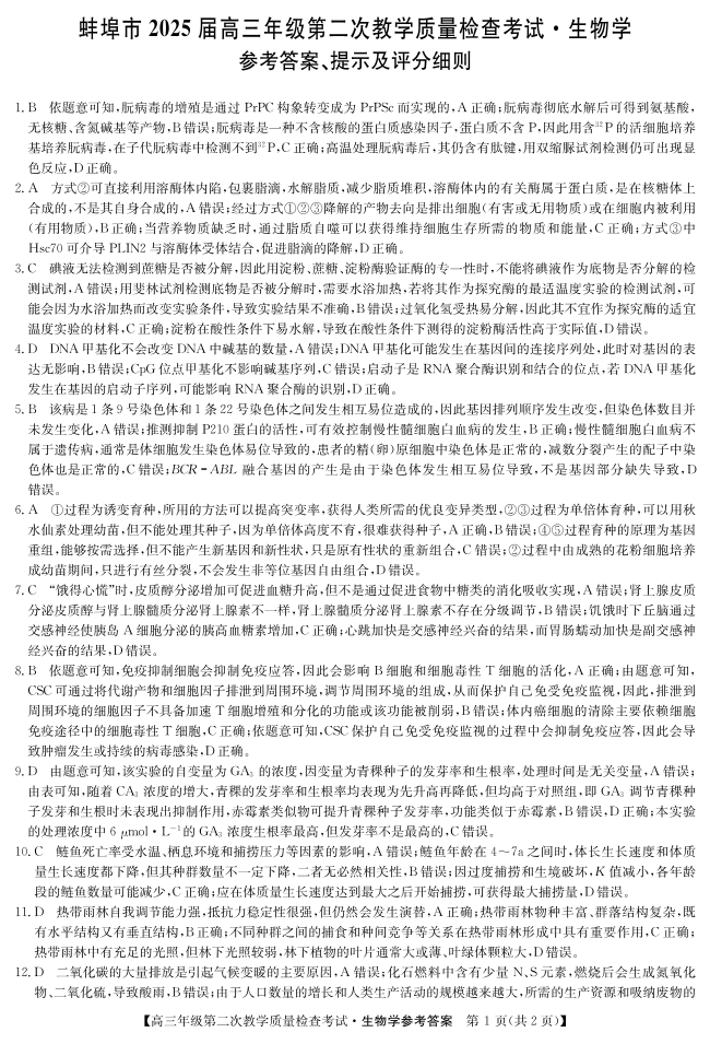 安徽省蚌埠市2025届高三年级第二次教学质量检查考试 生物答案.pdf
