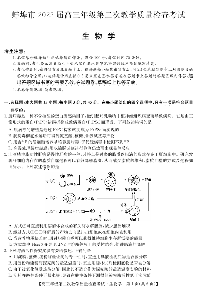 安徽省蚌埠市2025届高三年级第二次教学质量检查考试 生物.pdf