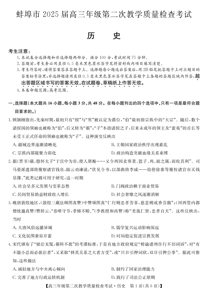 安徽省蚌埠市2025届高三年级第二次教学质量检查考试 历史.pdf