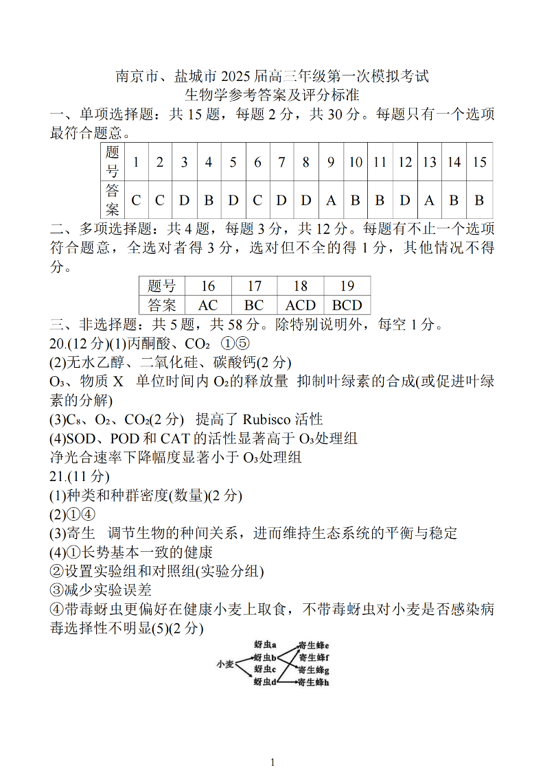 江苏省南京市、盐城市2025届高三年级第一次模拟考试 生物答案.pdf