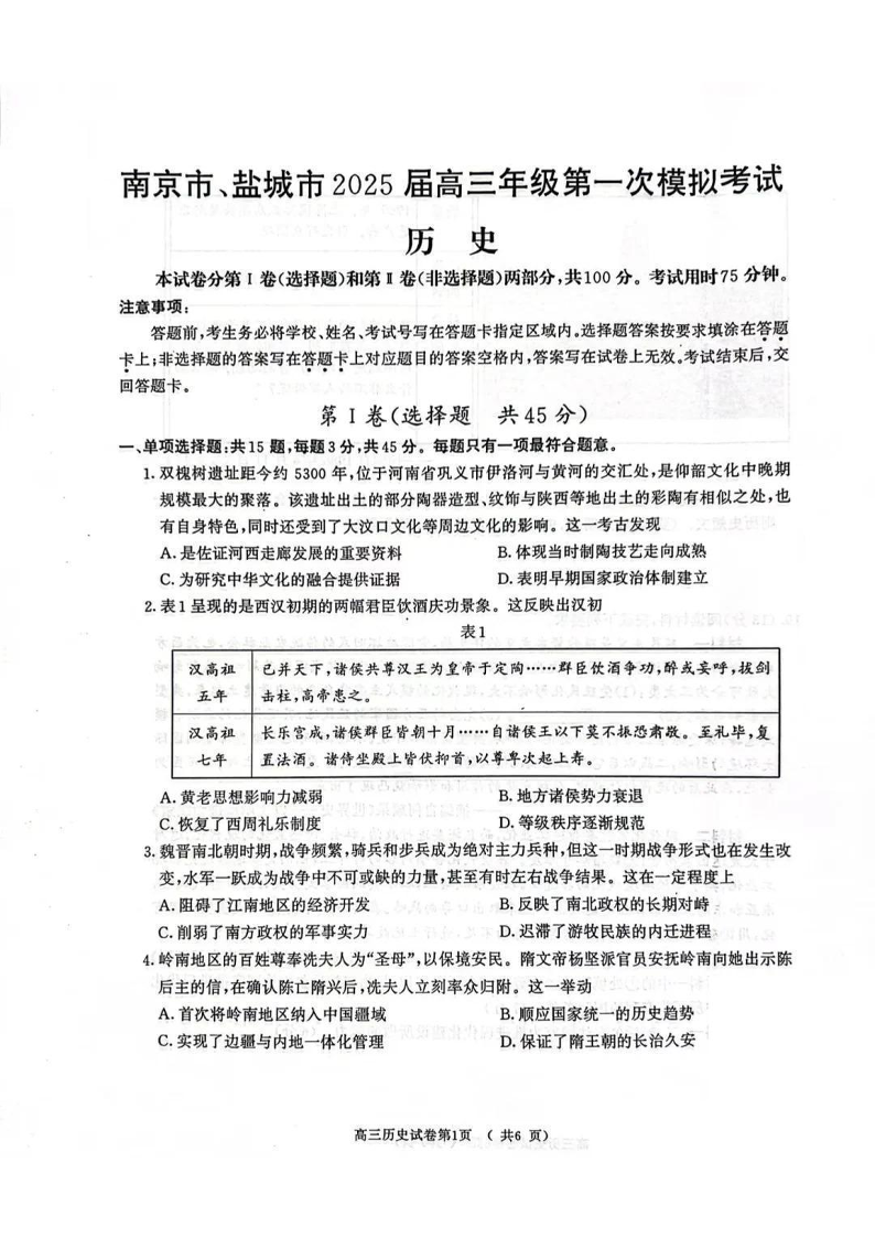 江苏省南京市、盐城市2025届高三年级第一次模拟考试 历史.pdf