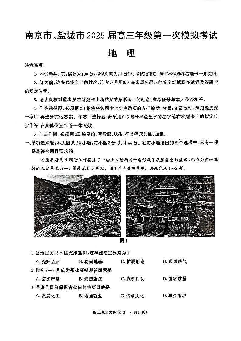 江苏省南京市、盐城市2025届高三年级第一次模拟考试 地理.pdf