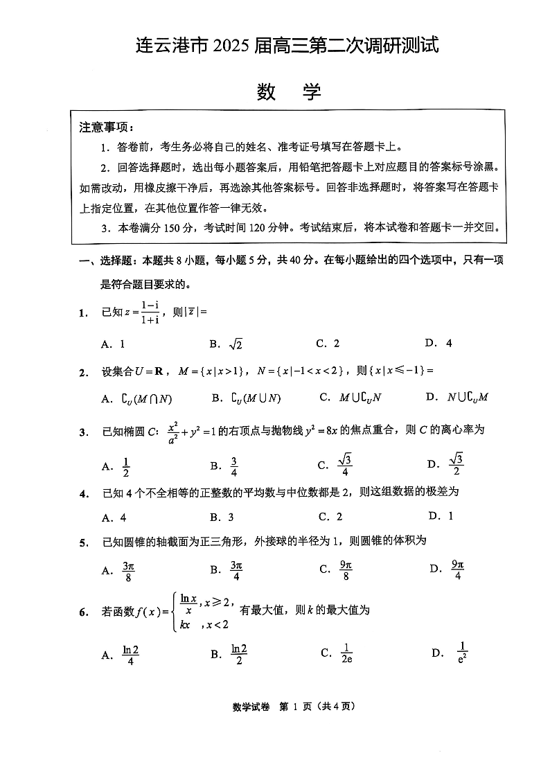 江苏省南通市(苏北七市)2025届高三第二次调研测试 数学.pdf