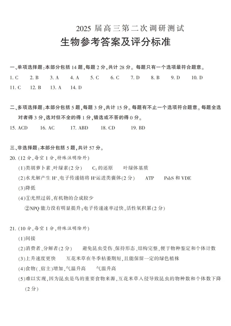 江苏省南通市(苏北七市)2025届高三第二次调研测试 生物答案.pdf