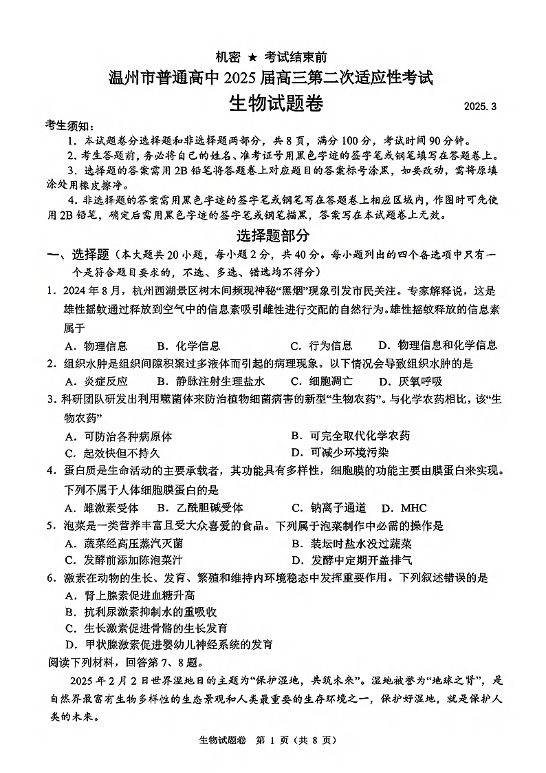 浙江省温州市2025届高三第二次适应性考试 生物.pdf