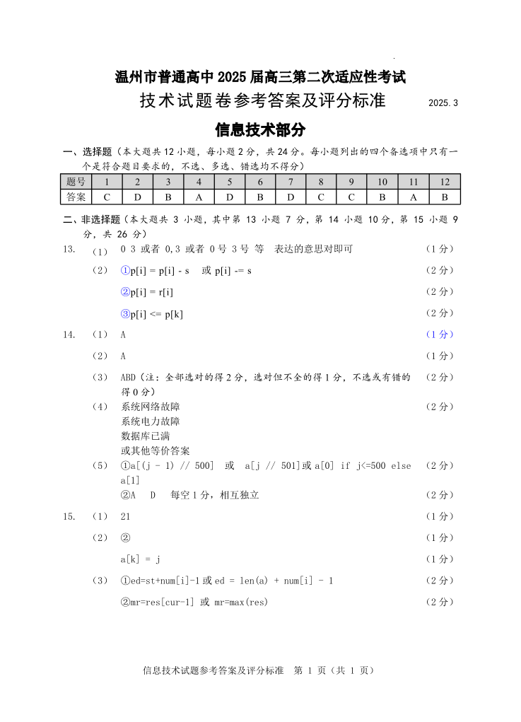 浙江省温州市2025届高三第二次适应性考试 技术答案.pdf