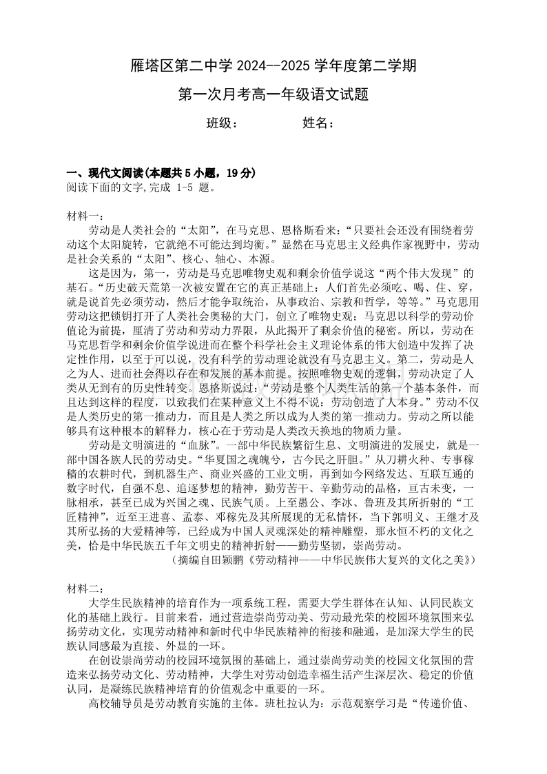西安市雁塔区第二中学2024-2025学年第二学期第一次月考 高一语文.pdf
