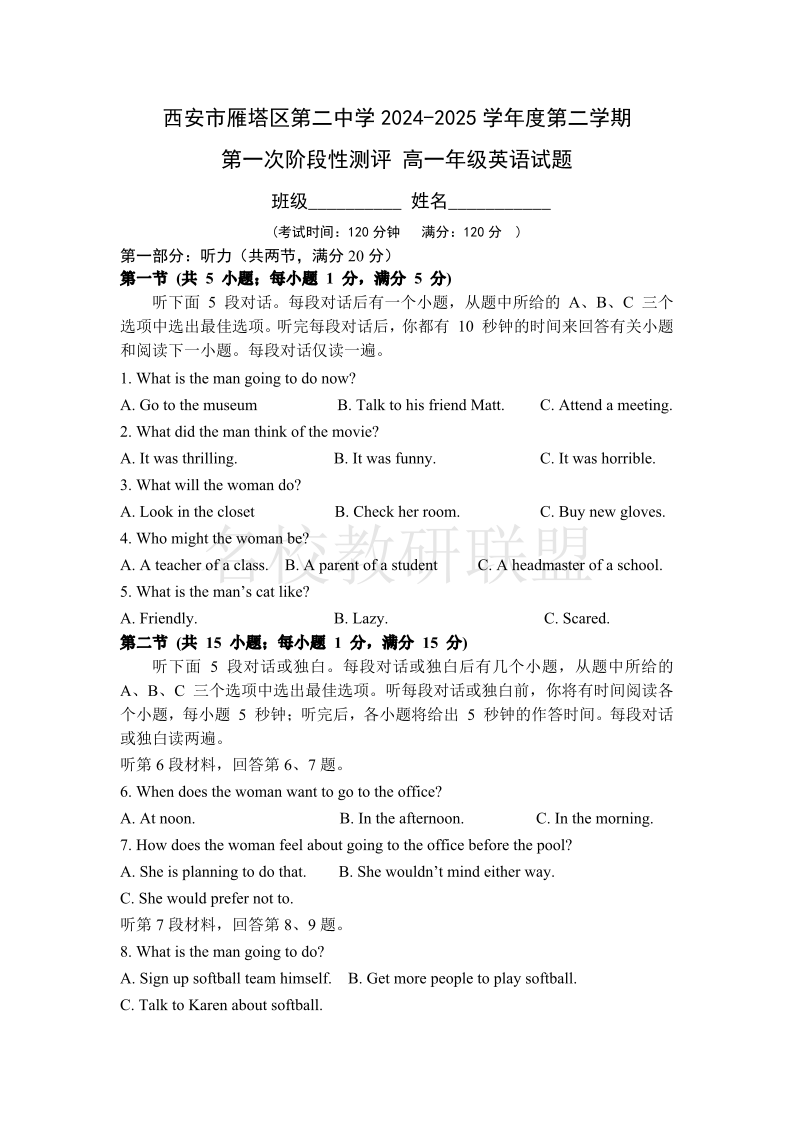 西安市雁塔区第二中学2024-2025学年第二学期第一次月考 高一英语.pdf