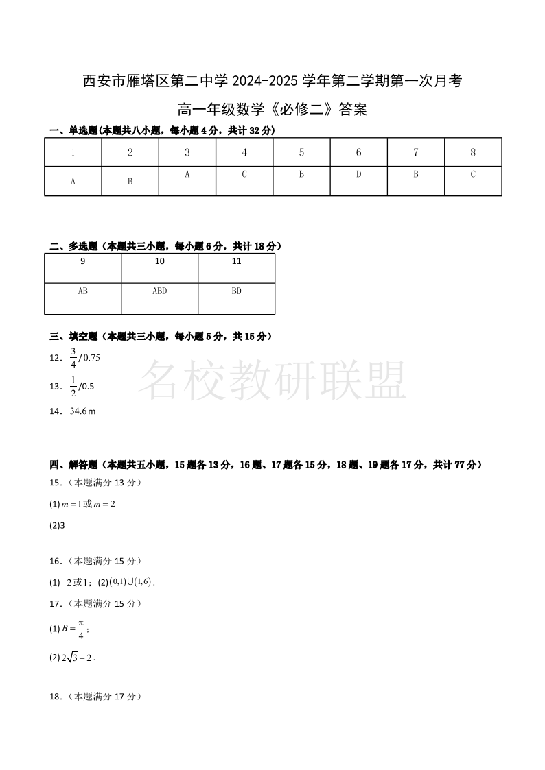 西安市雁塔区第二中学2024-2025学年第二学期第一次月考 高一数学答案.pdf