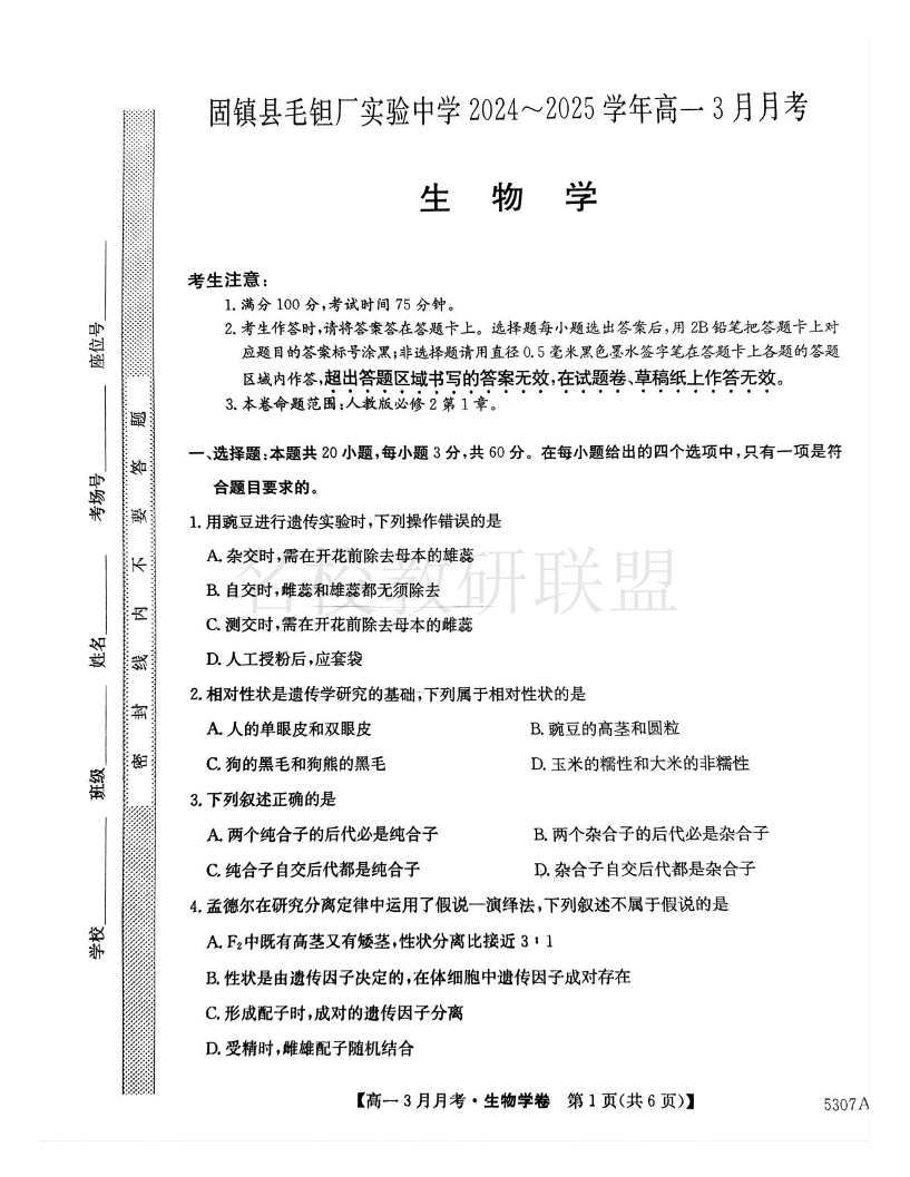 安徽省蚌埠市固镇县毛钽厂实验中学2024-2025学年高一下学期3月月考生物试题.pdf