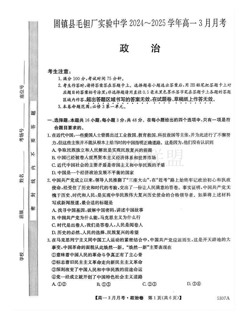 安徽省蚌埠市固镇县毛钽厂实验中学2024-2025学年高一下学期3月月考 政治.pdf