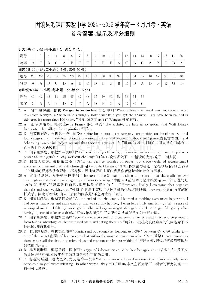安徽省蚌埠市固镇县毛钽厂实验中学2024-2025学年高一下学期3月月考 英语答案.pdf