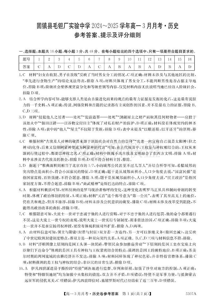 安徽省蚌埠市固镇县毛钽厂实验中学2024-2025学年高一下学期3月月考 历史答案.pdf