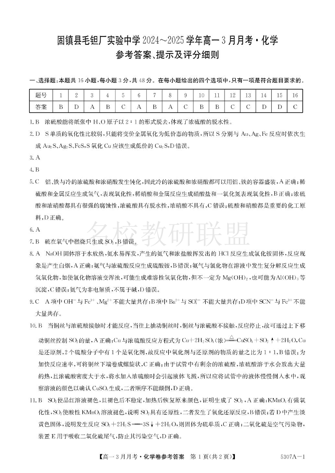 安徽省蚌埠市固镇县毛钽厂实验中学2024-2025学年高一下学期3月月考 化学答案.pdf