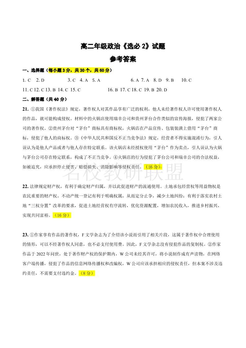 西安市雁塔区第二中学2024-2025学年第二学期第一次月考 高二政治答案.pdf