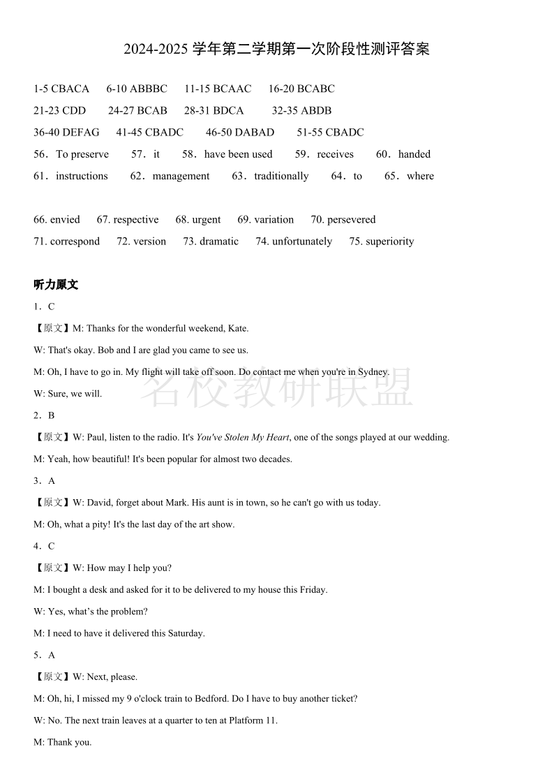 西安市雁塔区第二中学2024-2025学年第二学期第一次月考 高二英语答案.pdf