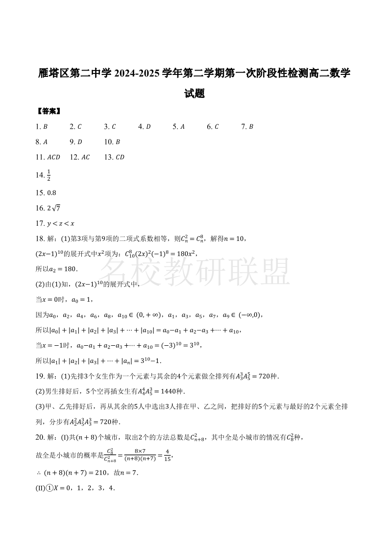西安市雁塔区第二中学2024-2025学年第二学期第一次月考 高二数学答案.pdf