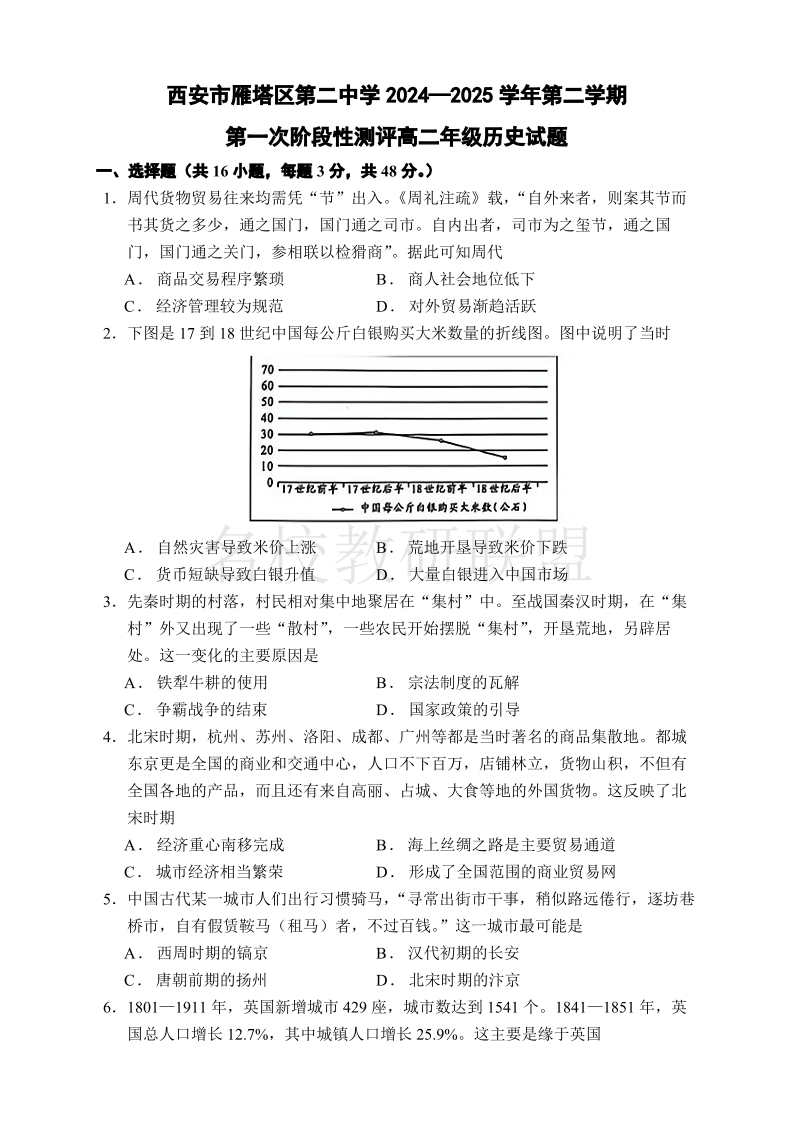西安市雁塔区第二中学2024-2025学年第二学期第一次月考 高二历史.pdf