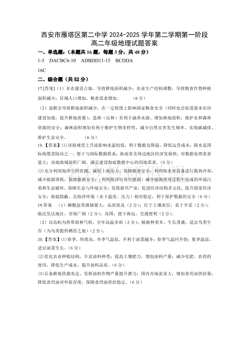西安市雁塔区第二中学2024-2025学年第二学期第一次月考 高二地理答案.pdf