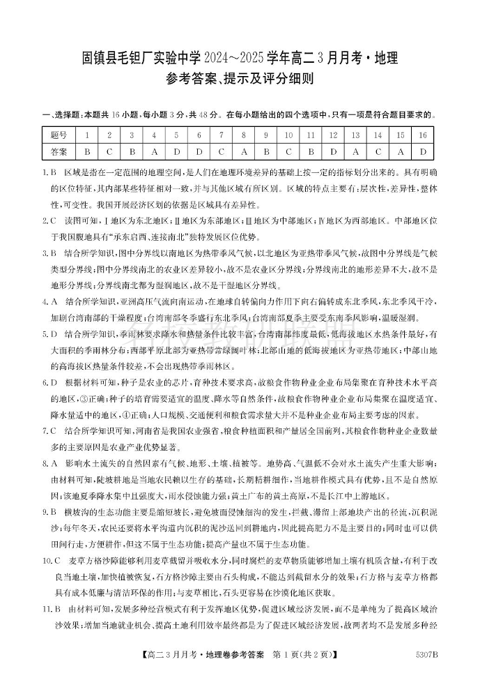 安徽省蚌埠市固镇县毛钽厂实验中学2024-2025学年高二下学期3月月考 地理答案.pdf