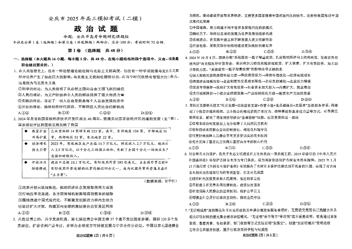 安徽省安庆市2024-2025学年高三下学期第二次模拟考试 政治.pdf