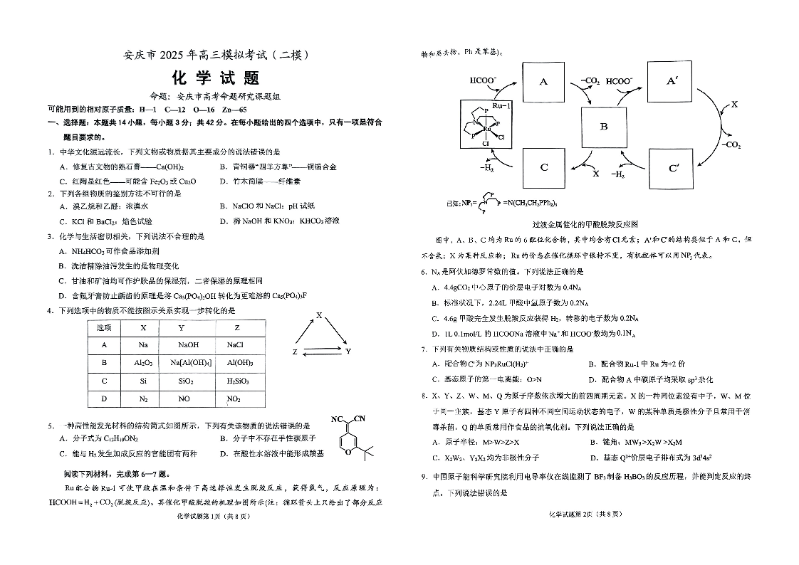 安徽省安庆市2024-2025学年高三下学期第二次模拟考试 化学.pdf