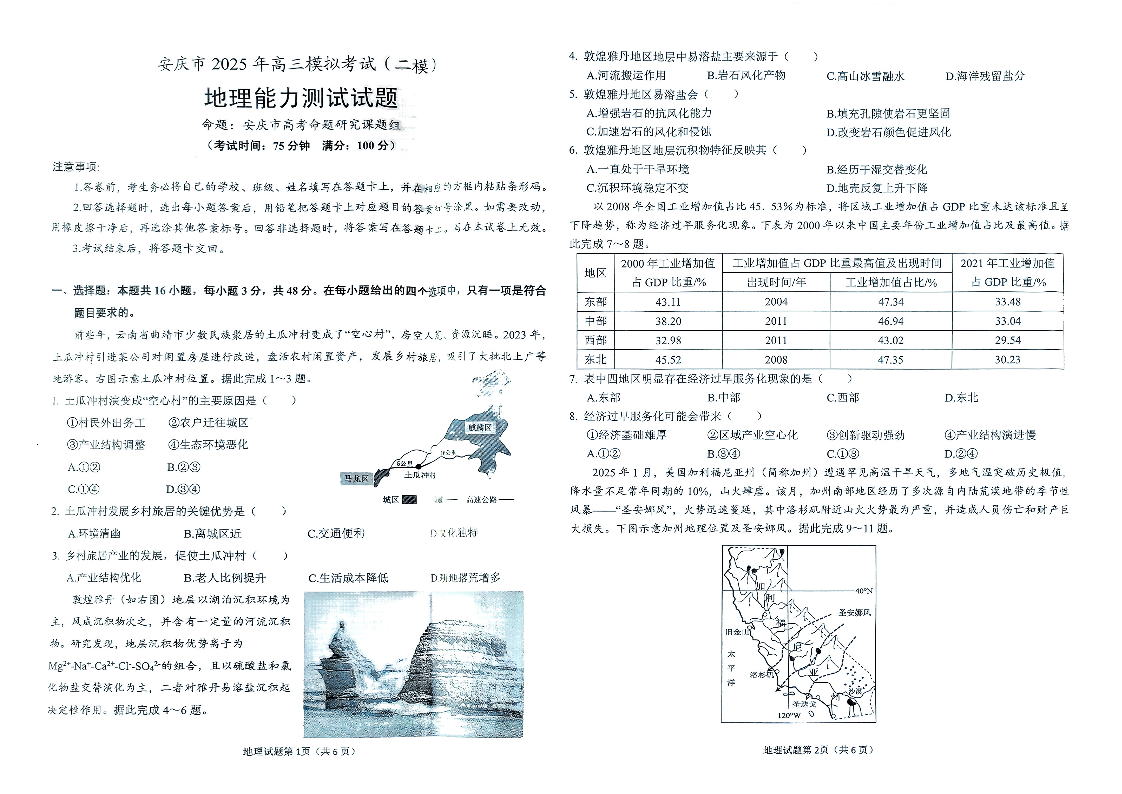 安徽省安庆市2024-2025学年高三下学期第二次模拟考试 地理.pdf