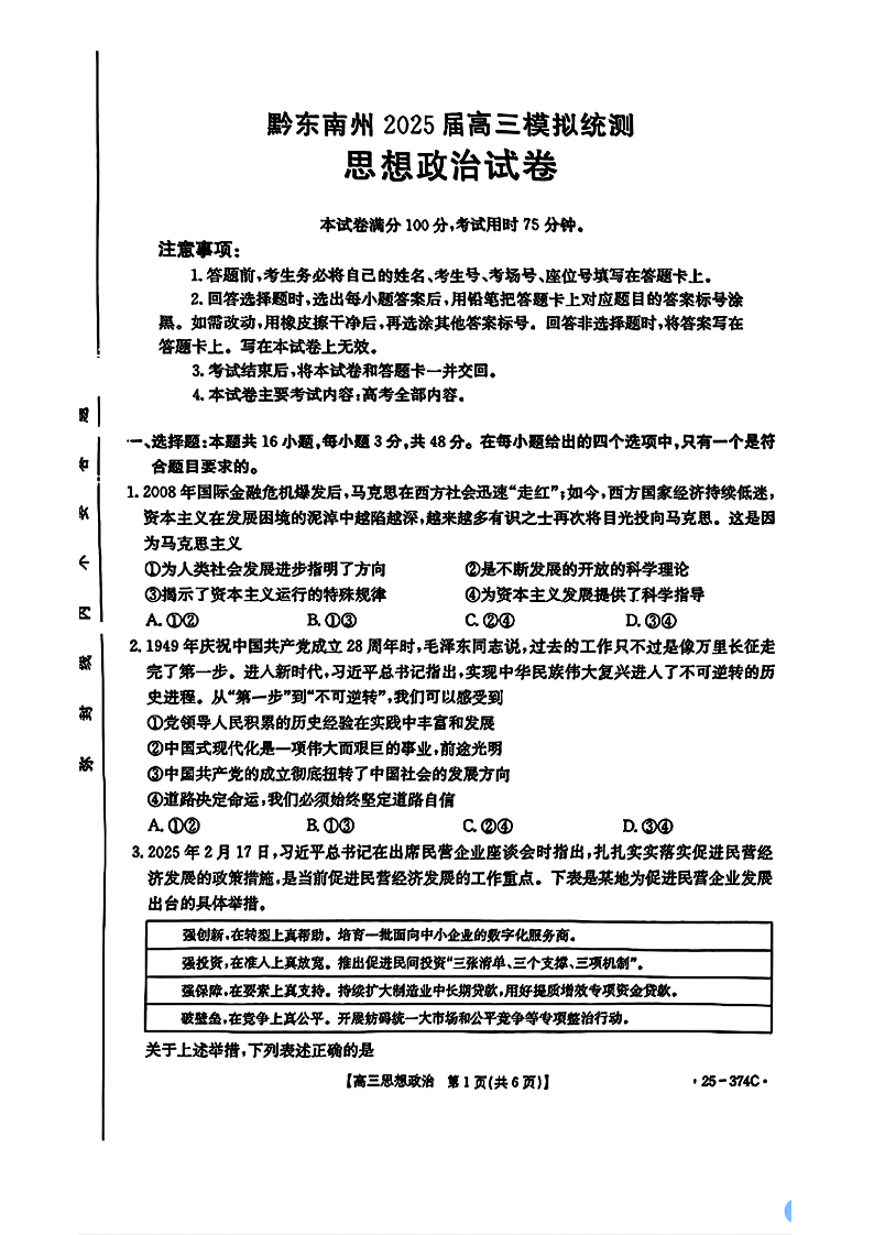 贵州省黔东南州2025届高三金太阳模拟统测 政治(含答案).pdf