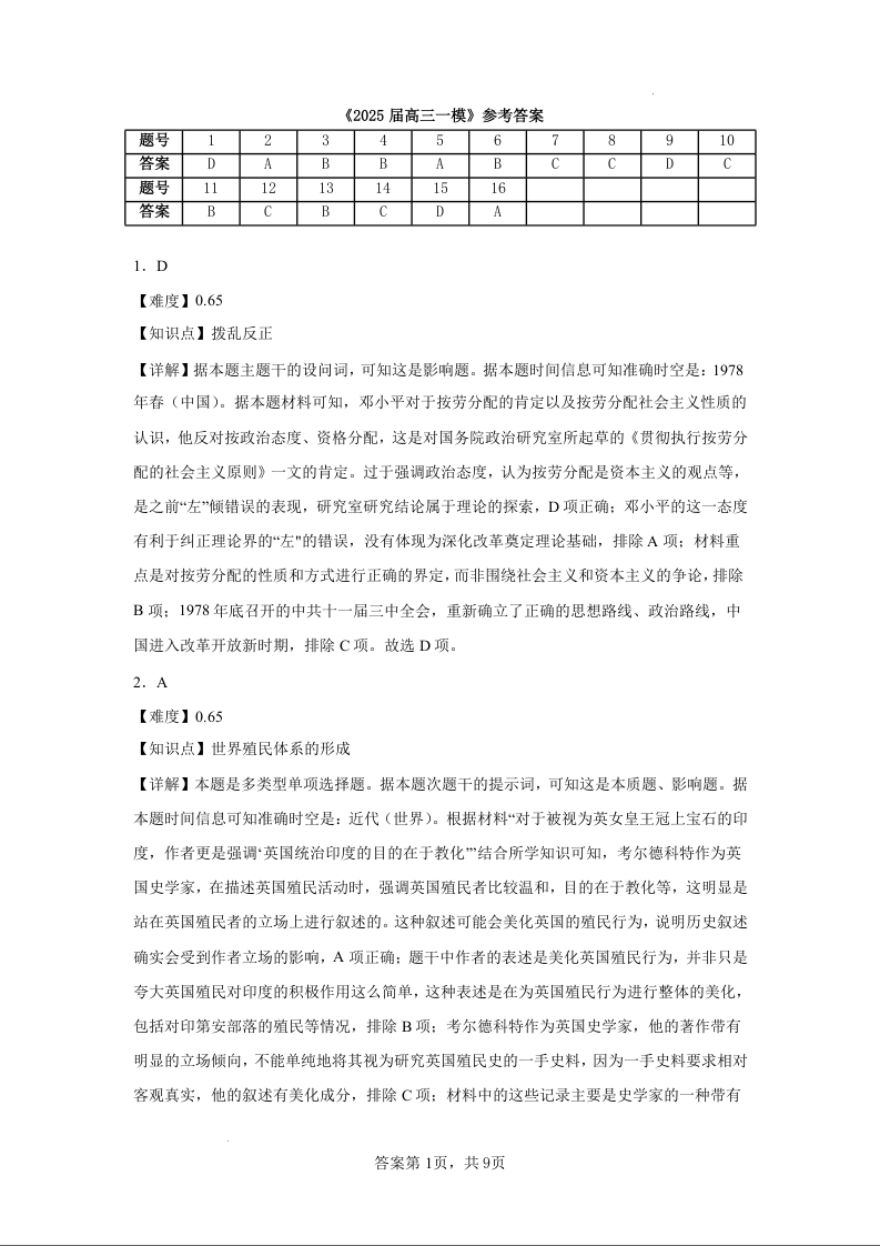 湖南省长沙市望城区第一中学2025届高三一模试题 历史答案.docx