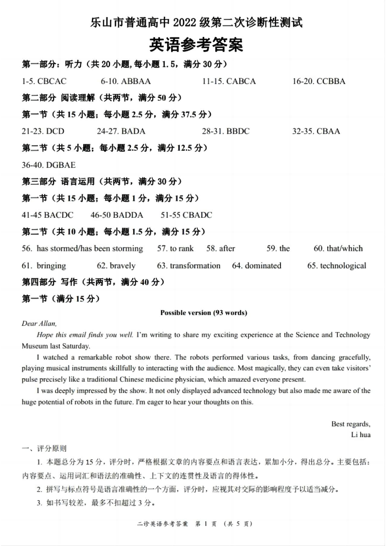 四川省乐山市,自贡市,宜宾市2025届高三第二次诊断性考试 英语答案.pdf