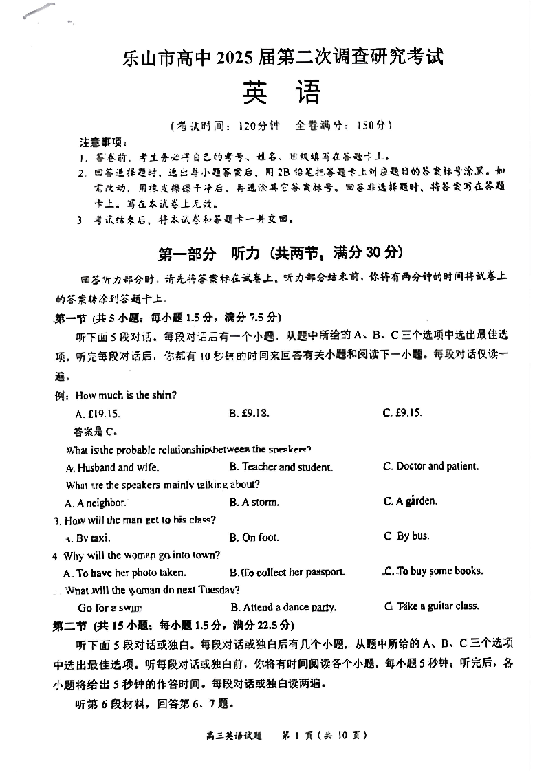 四川省乐山市,自贡市,宜宾市2025届高三第二次诊断性考试 英语.pdf