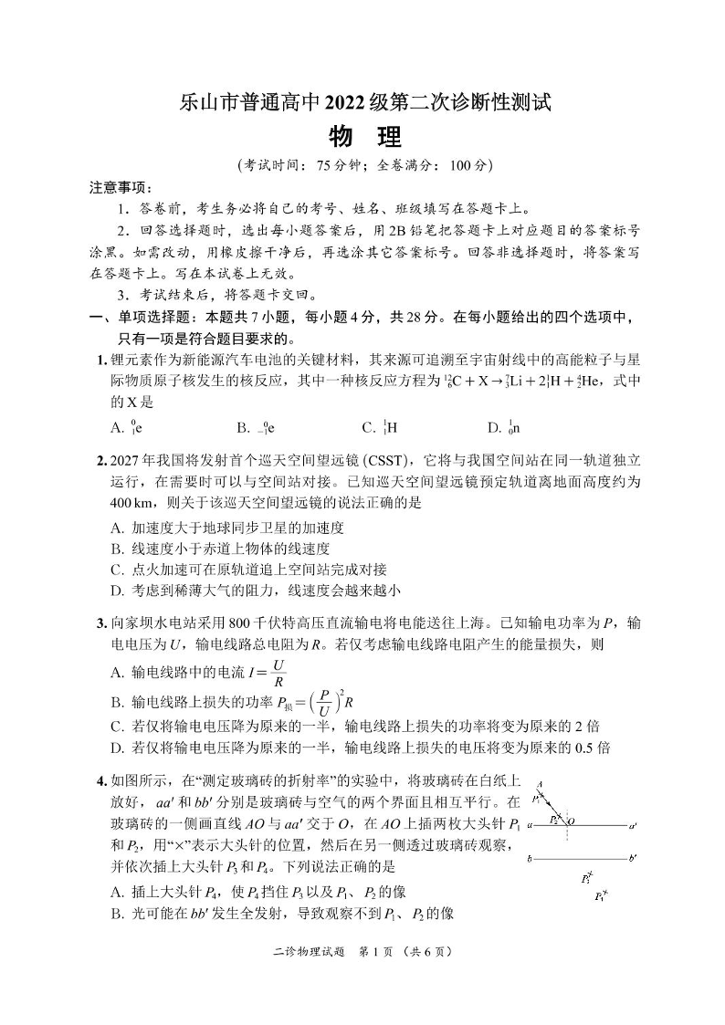 四川省乐山市,自贡市,宜宾市2025届高三第二次诊断性考试 物理(含答案).pdf