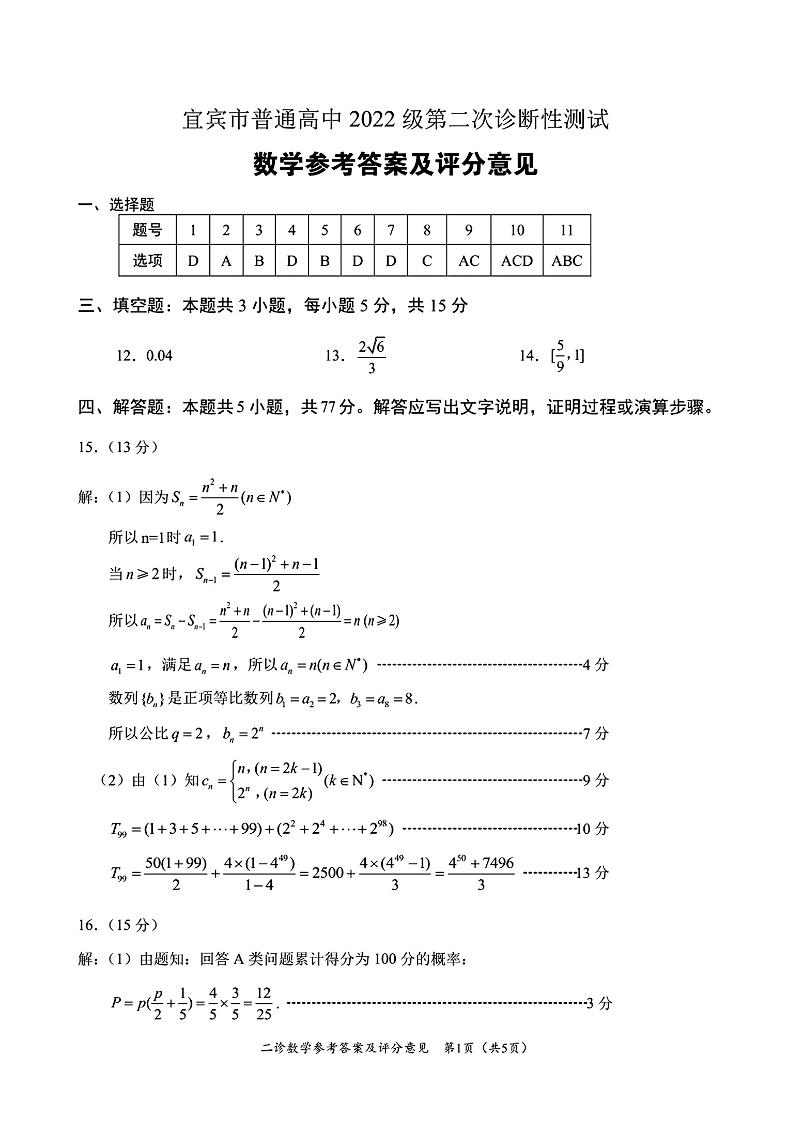 四川省乐山市,自贡市,宜宾市2025届高三第二次诊断性考试 数学答案.pdf