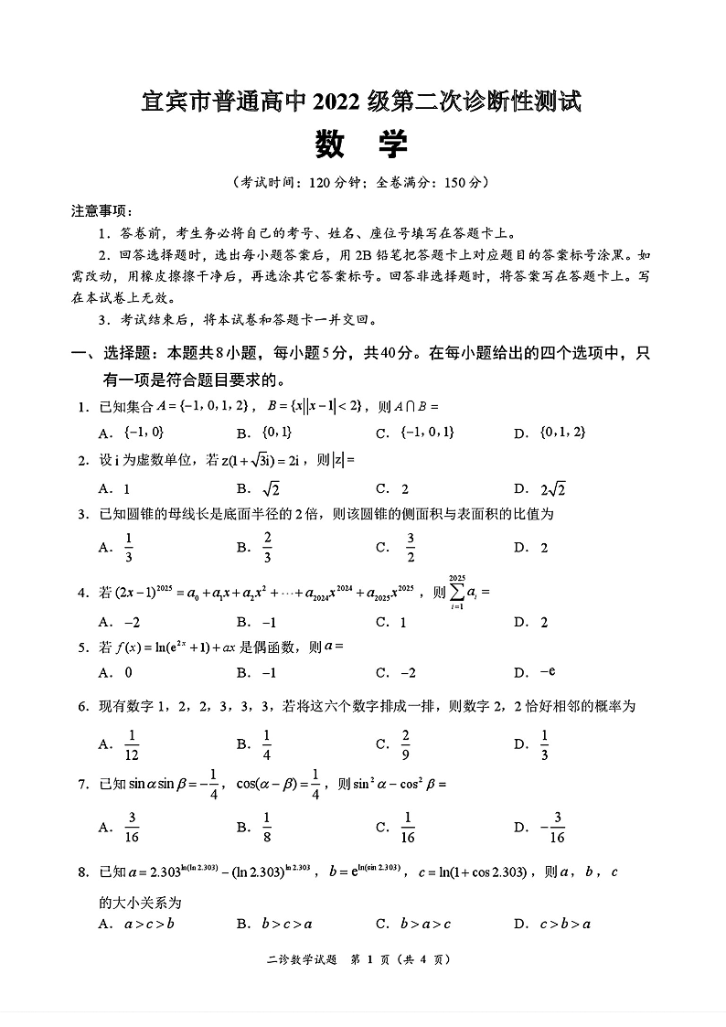 四川省乐山市,自贡市,宜宾市2025届高三第二次诊断性考试 数学.pdf