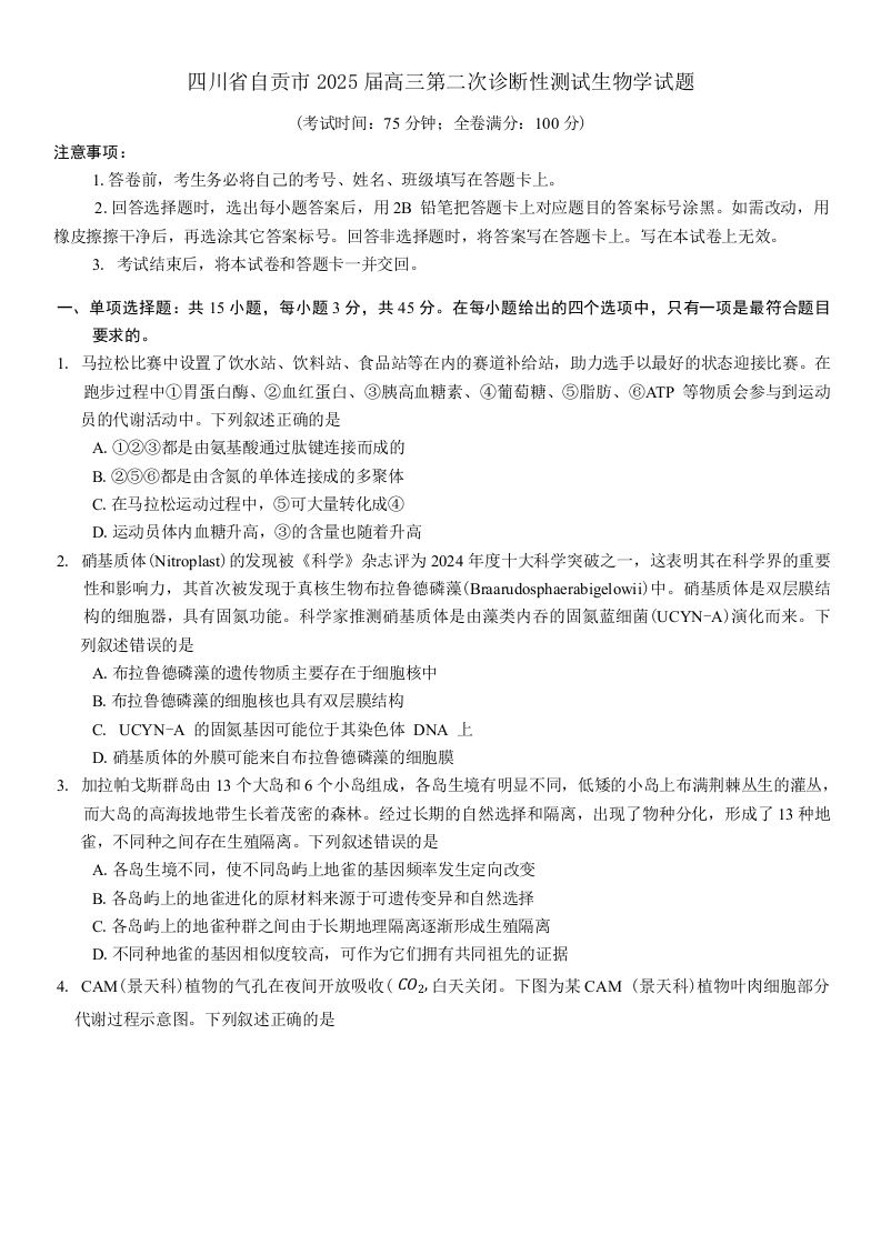 四川省乐山市,自贡市,宜宾市2025届高三第二次诊断性考试 生物.docx