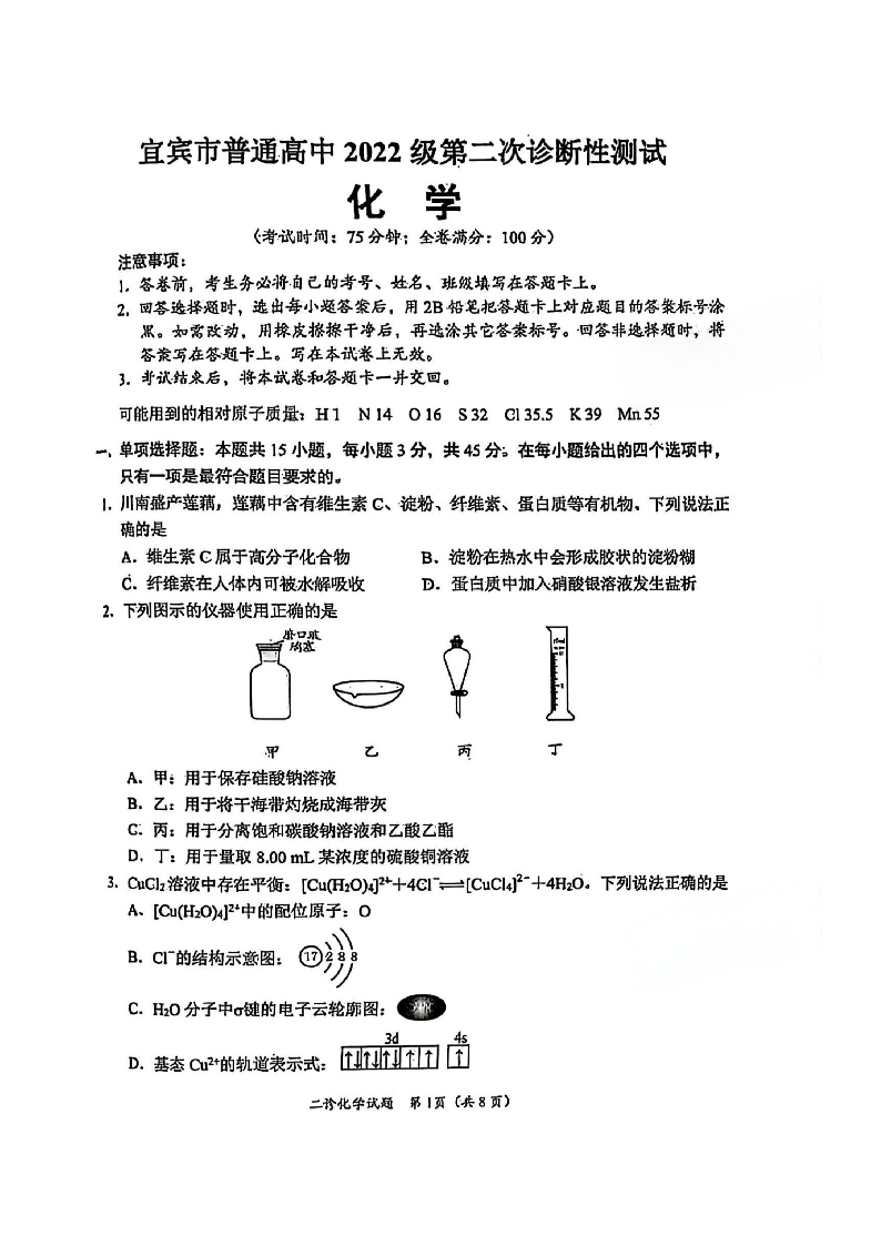 四川省乐山市,自贡市,宜宾市2025届高三第二次诊断性考试 化学.pdf