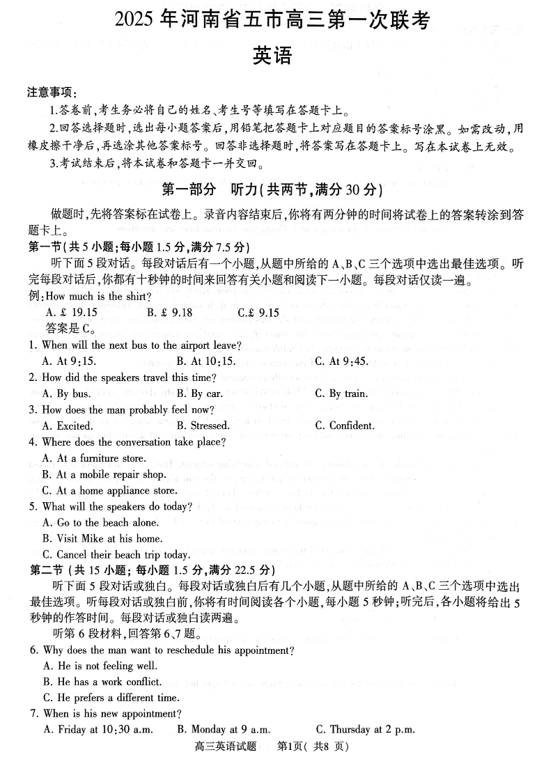 河南省(驻马店、漯河、南阳、信阳、三门峡)五市2025年高三第一次联考 英语.pdf