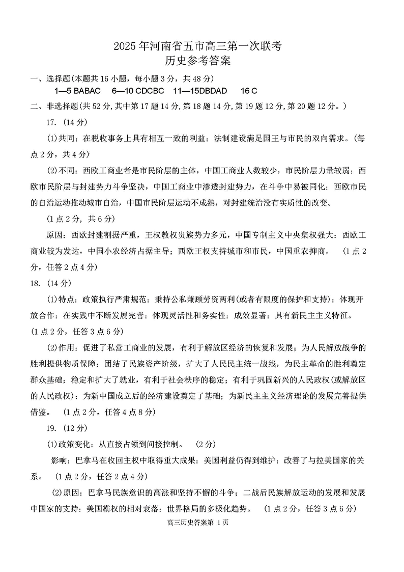 河南省(驻马店、漯河、南阳、信阳、三门峡)五市2025年高三第一次联考 历史答案.pdf