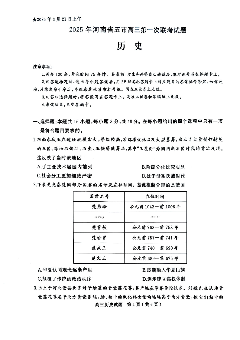 河南省(驻马店、漯河、南阳、信阳、三门峡)五市2025年高三第一次联考 历史.pdf